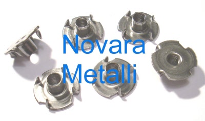 Tee nuts are round nuts with four points used to fasten something to wood - Tee nuts must be pressed in wood - the 4 points avoid rotation of the nut in the wood - Tee nuts means T-shape nuts - zinc plated steel and stainless steel - inside metric thread - used in ready to assemble furniture.